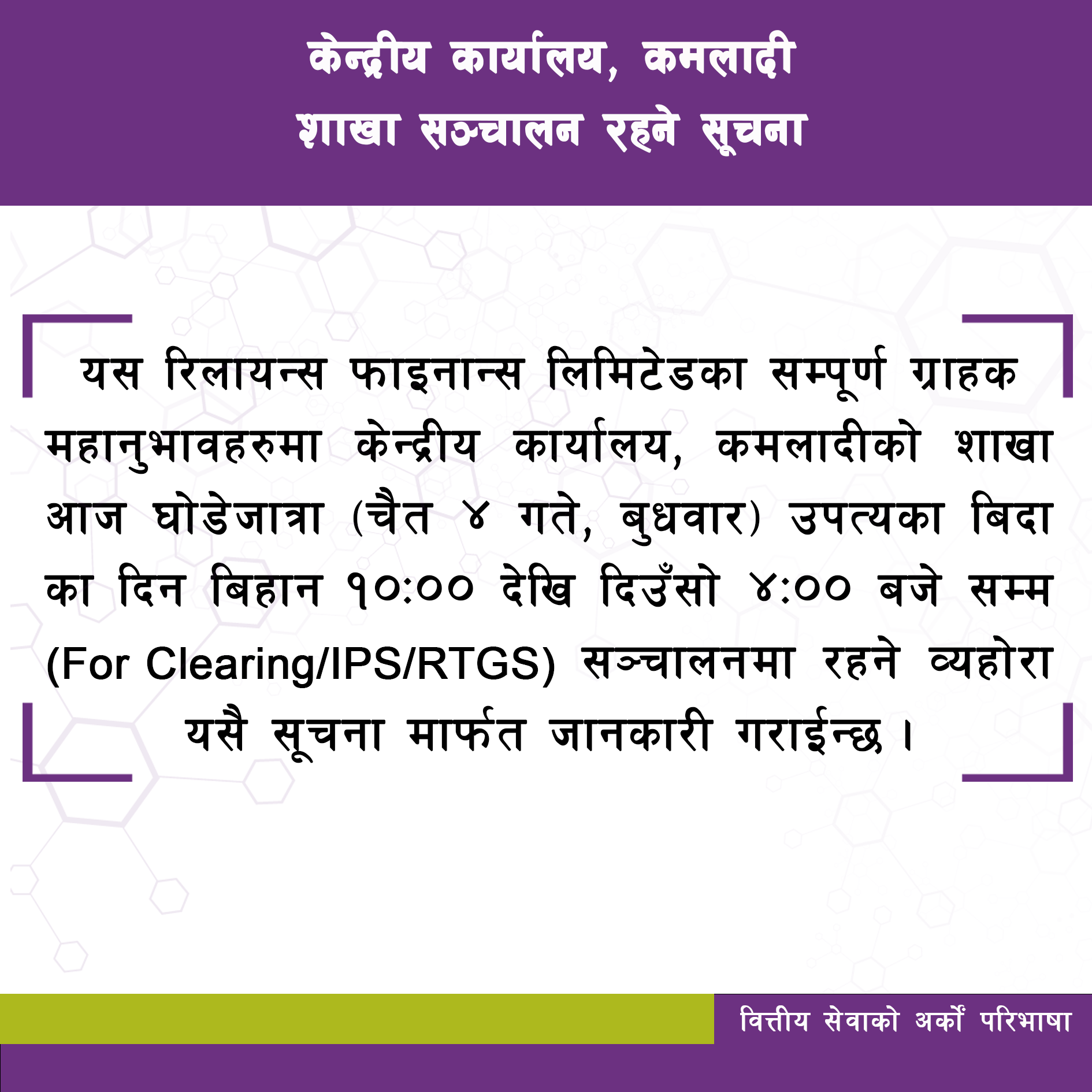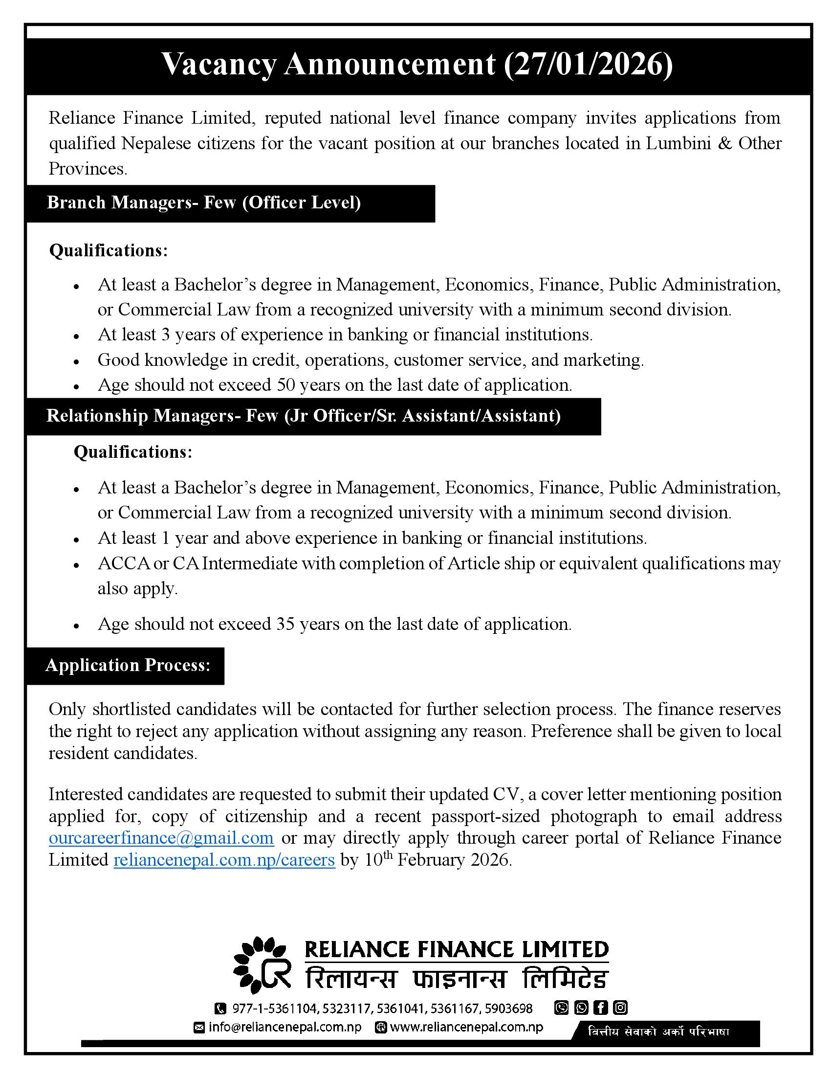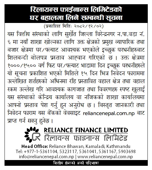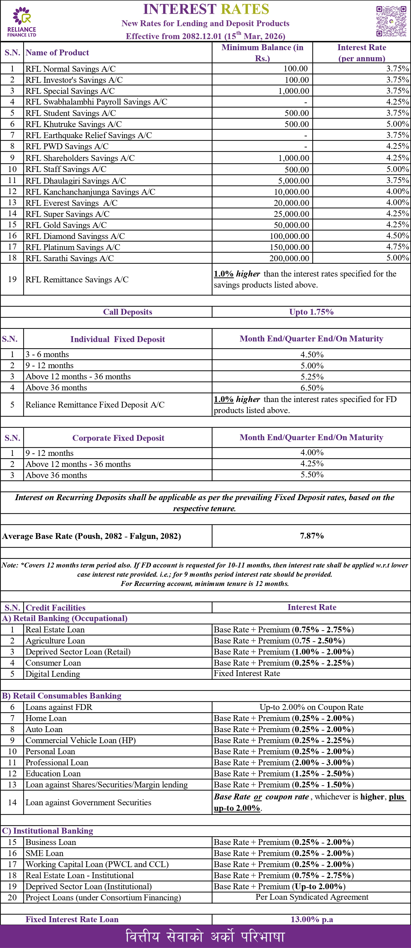 Reliance Finance Limited, a “C” class financial institution, incorporated in the year 2066 B.S and licensed by Nepal Rastra Bank to undertake financial services, has established itself as one of the leading finance company of Nepal.